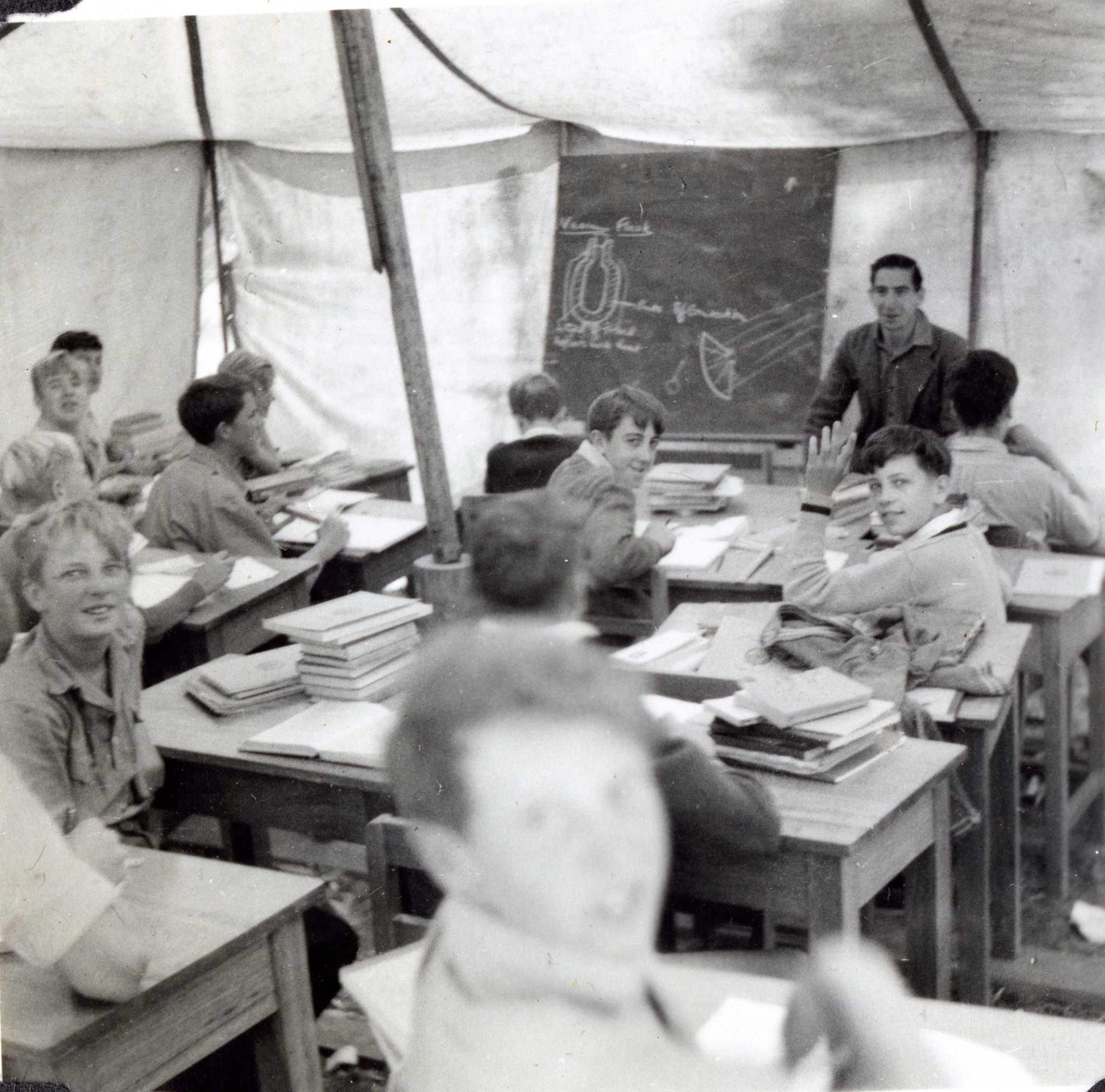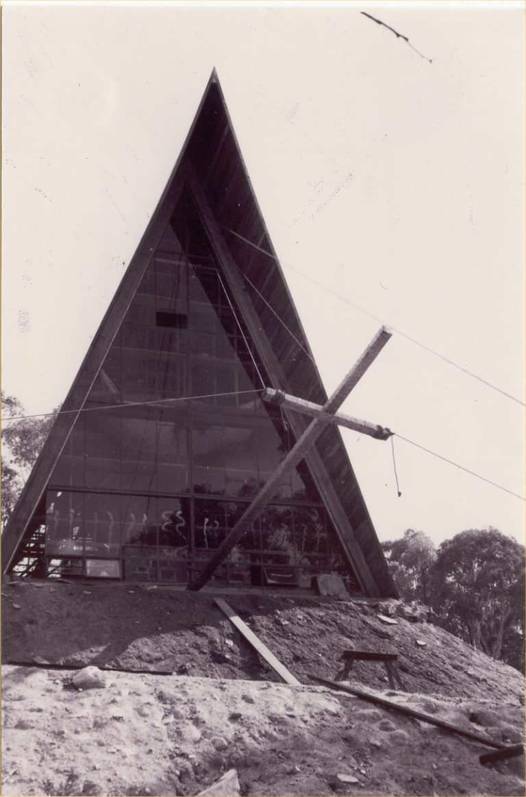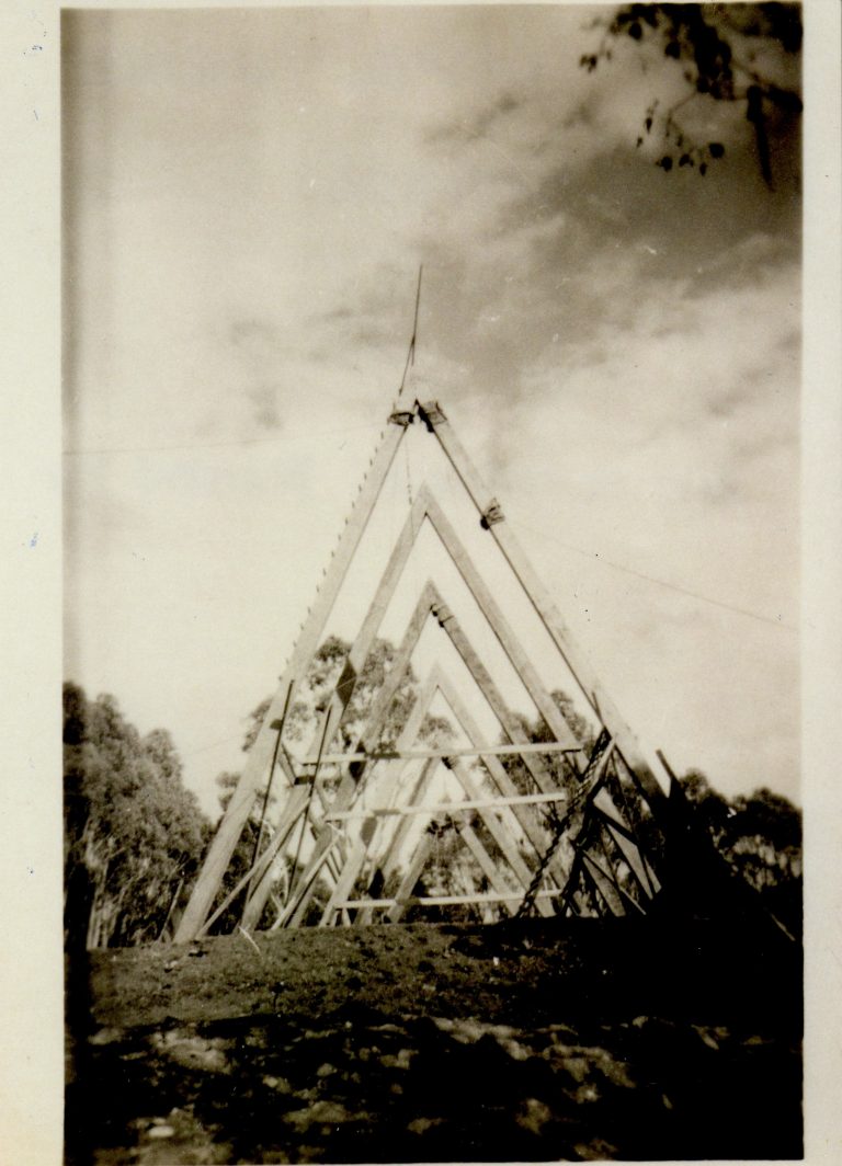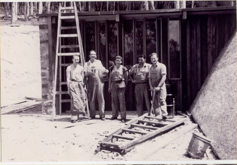The Herculean task of building Timbertop began at Corio – four pre-fabricated structures were built in the paddock behind Francis Brown House as a ‘national service’ project in Term 1, 1952, and transported to Timbertop at Easter for the first of several work camps. A Nissen hut donated by the Gebhart family was the first permanent structure. Harold Doughty bulldozed a temporary road. A bridge was built over the creek. When 34 teenage boys arrived at Timbertop at the beginning of February 1953 there were two units for students, but aside from one house, there were only tents for staff, no dining hall, no kitchen, no classrooms, no library, no telephone and no running water.